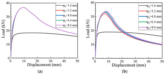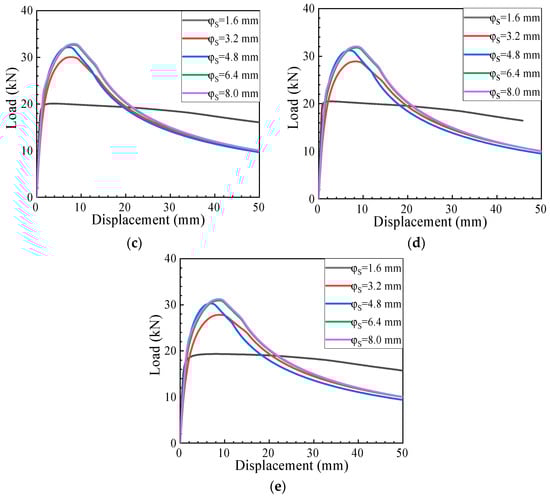 Load–compression curves of columns for different cable diameters: (a) ; (b) ; (c) ; (d) ; (e) .