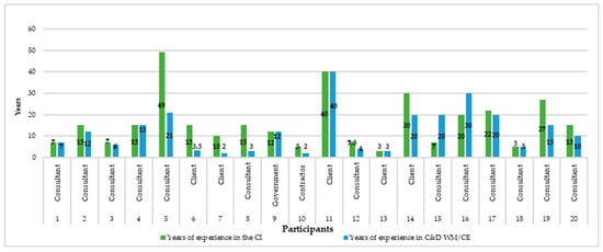 Initially, preliminary interviews were conducted to understand the transition from traditional linear methods to CE-focused practices in construction. These interviews provided critical insights into the motivations for adopting CE in Australian CPs, chosen for their ability to prompt detailed discussions while allowing for the exploration of new themes []. A total of 20 participants, including CE experts and professionals in the CI, were interviewed. These participants were categorised by their roles (e.g., consultant side, client side, government side, and contractor side), as detailed in Figure 1. The participants generally had significant experience in the CI, in years of duration ranging from 3 to 49, and experience in C&D WM/CE, in years of duration ranging from 2 to 15. This sample size was selected to achieve data saturation—a key consideration in qualitative studies [].