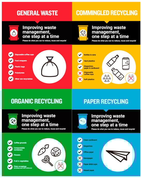 As indicated in the interview transcriptions, Senior Project Engineer B highlighted the importance of sorting waste materials during the operation stage, contributing to more effective WM. Project Engineer B also stated that “… from an operation point of view, there’s probably a bit more sort in, like separating waste. I can see, when I was walking through the floors, that they could separate, like cardboard … waste, recyclable, etc. …”. As shown in Figure 3, the red-lid bins are for general waste, the yellow-lid bins are for mixed recycling waste, the green-lid bins are for organic waste, and the blue bins are for mixed paper and card.