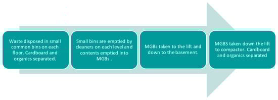 Senior Project Engineer B suggested that the waste-separation practices employed in the building contribute to its overall sustainability and WM efficiency. They further mentioned, “I think when that comes down to the waste room, I would think that that gets split up and makes it overall better in a way as well …”. As shown in Figure 5 and in Case Study B, the waste will be initially collected in bins located on each office floor.