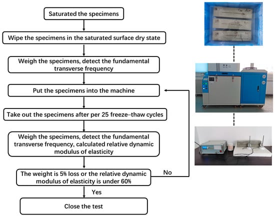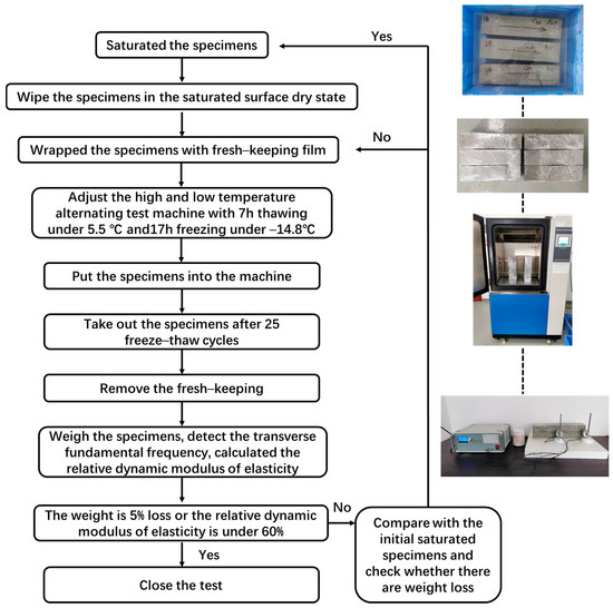 After 28 days of curing, we placed the test block in distilled water and then removed it after 4 days. We wiped it until the surface of the test block was dry and then weighed it. We wrapped and sealed it tightly with more than 10 layers of cling film. We placed the sealed test block in a high and low temperature alternating test box and set it to melt at 5.5 °C for 7 h and freeze at −14.8 °C for 17 h. We simulated the freeze–thaw behavior in a natural environment so it was consistent with the rapid freeze–thaw method. We removed the test piece every 25 cycles, along with the cling film, weighed the mass loss, and tested the fundamental transverse frequency according to the China Standard GB/T 50082-2009 [25] and calculated the relative dynamic modulus. If it was found that the moisture content of the test block had decreased during weighing, the test block was placed in water again to absorb water until saturation. We then resealed and placed it in a freeze–thaw test box with a temperature that alternated between high and low. If there was no significant change in moisture content loss during weighing, it would be directly sealed. Figure 4 and Figure 5 show the sealing situation between the test device and the test block. Figure 6 shows the procedure of the simulated freeze–thaw test.