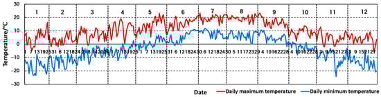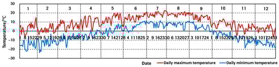 A temperature survey was conducted before the simulation. The temperature data were obtained from the National Weather Service of China. Daily changes in high and low temperatures along the Jiuma Expressway are shown in Figure 2 and Figure 3. From October to April of the following year, the daily high and low temperatures crossed 0 °C every day. The Jiuzhi and Hongyuan are two typical plateau counties along the Jiuma Expressway.