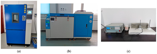 Test machine: (a) test machine with a temperature that alternated between high and low; (b) rapid freeze–thaw test machine; (c) lateral fundamental frequency test machine.