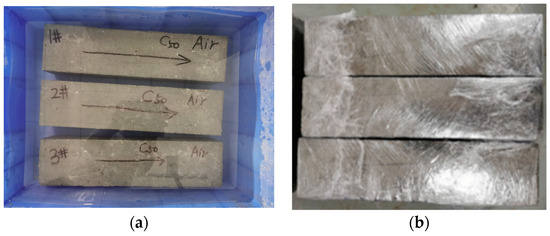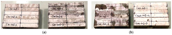 Appearance of different concretes after simulating the natural freeze–thaw recycle test: (a) common concrete; (b) air-entrained concrete. Note: the letters on the specimen are the marks for distinguishing the different ones. C30 or C50 means the strength level classification. The symbol A means this is air-entrained concrete. The number 100% means the degree of saturation in the concrete is 100%. The numbers 1 to 3 are the block numbers of different specimens to distinguish them in a group. For example, the C30A-100%-1 means this is an air-entrained concrete with C30 strength level classification and its degree of saturation is 100% and its serial number is 1 in the same group.