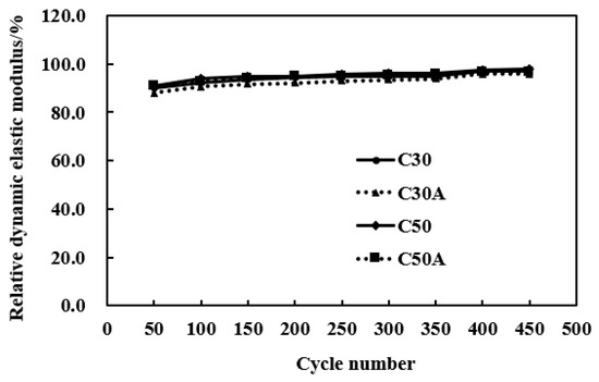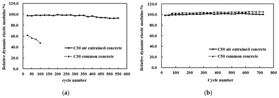 Relative dynamic modulus of elasticity vs. cycles of freeze–thaw recycle: (a) C30 concretes; (b) C50 concretes.