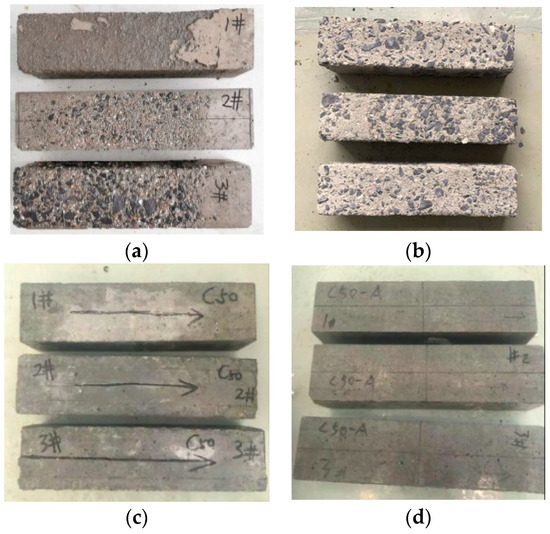 Appearance of the concretes after rapid freeze–thaw test: (a) C30 common concrete (50 cycles); (b) C30 air-entrained concrete (450 cycles); (c) C50 common concrete (50 cycles); (d) C50 air-entrained concrete (450 cycles). Note: the symbols on the specimens are the main information label for distinguishing the different specimens. For example, C50 means that the concrete compress strength level is C50. The 1# means it is the first specimen of this group because three are needed in one group test. C50-A means that this specimen is air-entrained concrete and its strength level is C50.
