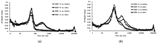 The pore distribution of the concrete before and after the freeze–thaw recycle test: (a) rapid freeze–thaw test; (b) simulating the nature freeze–thaw test.