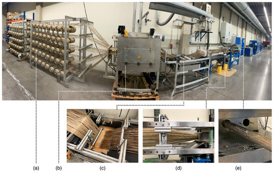 Pultrusion production line at CG TEC GmbH: (a) flax fiber rovings, (b) fiber-drying oven, (c) resin basin, (d) fibers entering the heated molding tool, (e) pultruded profile Ø25 mm exiting the mold. © Photos: CG TEC, collage: BioMat.
