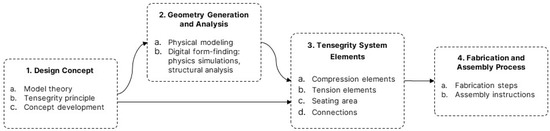 The workflow utilized for the realization of this project is structured into four integral phases: first, the conceptual design stage where initial ideas are developed and refined; second, the geometrical generation and analysis, involving physical and digital models, and the form-finding and structural analysis using a tensegrity solver; third, the selection of the tensegrity system elements, focusing on identifying suitable material options and assessing their properties for the intended application; and fourth, the fabrication and assembly of physical demonstrators, encompassing the physical realization and integration of the designed components. This systematic approach ensures a thorough exploration from concept to implementation in the development of the tensegrity structure (Figure 2).