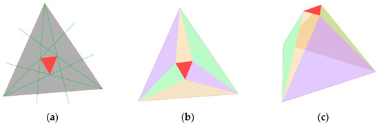 Before the concept of a tensegrity structure made of pultruded profiles with a membrane was developed, the initial design focused on the mathematical justification of the geometry and its practical realization. A pattern for constraining the geometry was sought and found through model theory. Model theory, a subfield of mathematical logic, describes the relevant elements of structures using an appropriate formal language. Inspired by the strength of triangles as a structural shape, research was conducted on Morley’s theorem, a significant milestone in model theory [23]. This theorem states that for any triangle, an equilateral triangle can be formed by intersecting its adjacent angle trisectors [24]. When considering solid shapes made of triangles, the versatility and robustness of triangular configurations were explored. For instance, constructing an equilateral Morley’s triangle and examining the resulting geometric properties led to new insights into the stability and strength inherent in such formations (Figure 3). The ability to transform these theoretical principles into practical structures underscores the importance of mathematical logic in geometric design.