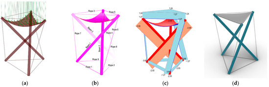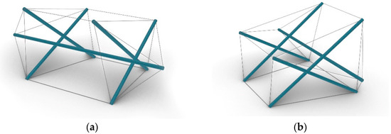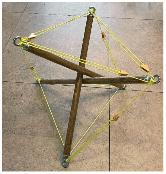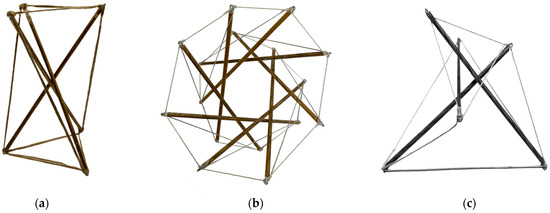 Tensegrity is a structural system characterized by its ambiguous principles and geometric and mechanical aspects. Coined by Buckminster Fuller in the 1950s, the term combines “tension” and “integrity”. The first tensegrity structure, a sculpture dating back to 1920, was created by the constructivist artist Karl Ioganson [14]. A tensegrity structure achieves equilibrium through a balance of tension and compression forces. Typically, cables provide tensile strength, stabilizing the entire system and maintaining the position of compressive elements, namely bars, ensuring overall structural stability [15,16]. Tensegrity structures exhibit four key characteristics: they can stand freely without external support, their structural members are exclusively linear, they consist of two types of elements—discontinuous struts that bear compression and continuous cables that bear tension—and, notably, the struts do not make direct contact with each other [17].