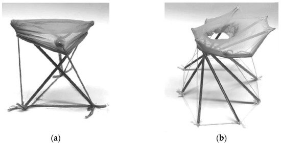 Tensegrity models integrating membrane to test seating area possibilities: (a) twist element with three bars, (b) symmetric tensegrity configuration with 8 beams.