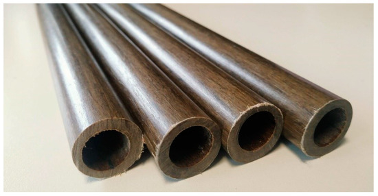 The so-called LeichtPRO-Profiles produced in this research are made from natural flax fiber rovings reinforced with a custom bio-based matrix system. They are round and hollow, with a diameter of 25 mm and a wall thickness of 4 mm, and can be manufactured to any length. Developed as structural components for various applications, these profiles underwent extensive mechanical testing to determine their properties. They have a compression strength of 118 MPa and an average flexural strength of 300 MPa. They exhibit notable flexibility, with a minimum radius of 2.4 m after a certain length, while shorter sections under 2 m display excellent compression behavior [8,9]. This characteristic inspired their use in this project for tensegrity structures, utilizing short compression bars.