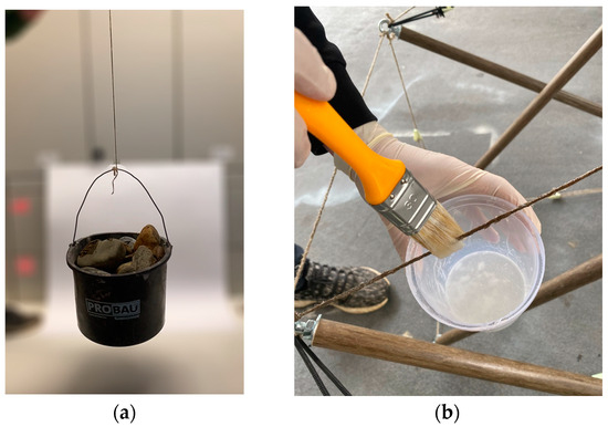 Tensile element first trial: (a) braided flax fibers holding 50 kg load, (b) impregnating flax fibers with resin.