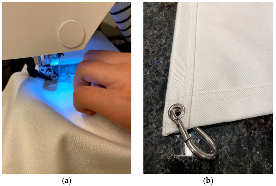 Textile fabrication: (a) sewing using double stitches, (b) detail including the eyelet and carabiner for connection.