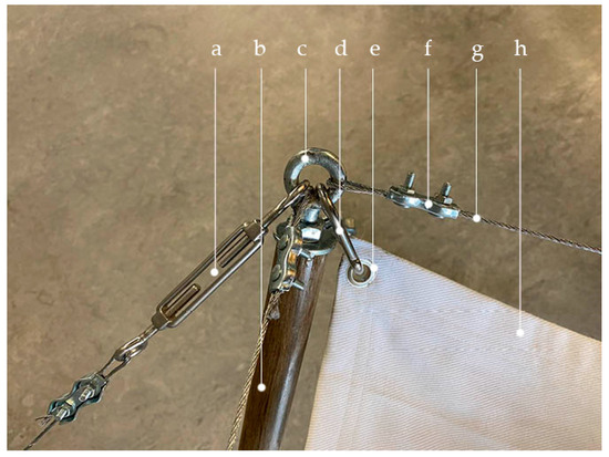 Connection point with its components: (a) turnbuckle, (b) biocomposite pultruded profile, (c) dowel with expansion anchor and an eyelet, (d) carabiner, (e) eyelet, (f) duplex clamp, (g) twisted steel cable, (h) textile as seat.