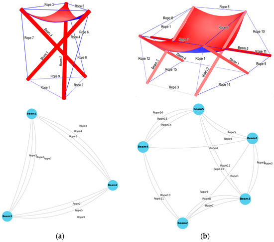 Graph representation of component connectivity: (a) Prototype 1: basic tensegrity principle, (b) Prototype 2: Tensegrity FlaxSeat.