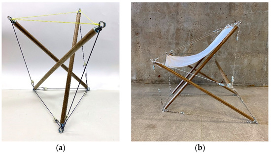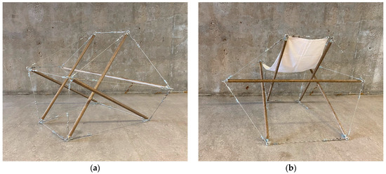 Having completed the design development and material selection, two furniture-scale prototypes were built to validate the system, and the chosen materials and their combinations. Following the assembly system, an initial prototype adhering to the basic tensegrity principle with a twist element consisting of three bars was constructed. In this prototype, guy line cables were utilized and pre-stressed with line loks (Figure 15a). This prototype was developed during the early stages of the material and system development, and served as a preliminary step before finalizing the chair prototype. The second and final prototype is a 1.5-m chair that integrates all the components discussed in Section 2.3, including steel cables and a suspended textile seat (Figure 15b). These two prototypes demonstrate the application of biocomposite pultruded profiles within a tensegrity system, showcasing both aesthetic and functional qualities. The subsequent sections compare material usage for both systems and also present the findings from structural analysis in comparison with physical load testing on the built prototypes.