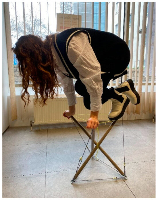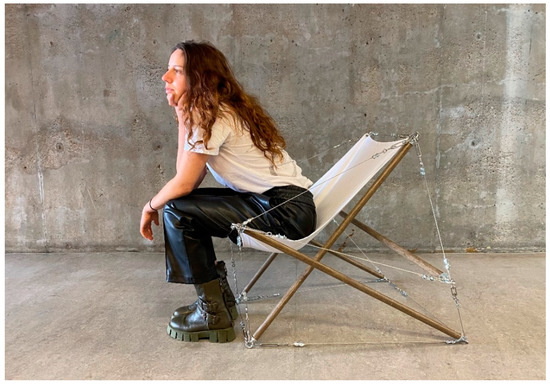 The main components of the system, including the suspended textile seat, are illustrated in Figure 18. Assembly can be easily completed using the diagrams provided in Figure 14. In total, this prototype utilizes five profiles and 17 cables. The profiles measure 1.4 m for the horizontal beam, with two sets of 1 m and 0.8 m each, totaling 5 m of biocomposite profiles. The overall dimensions of the main tension elements are depicted in Figure 19, with the cables totaling 11 m in length. The suspended membrane, covering an area of 0.6 m2, is attached to and supported by the four upper nodes of the system, creating a hammock-style chair. The completed Tensegrity FlaxSeat offers a functional and ergonomic seating solution capable of supporting the weight of one person (Figure 20) and even more.