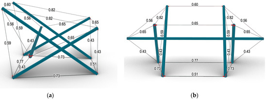 After exploring the basic system (Figure 6), additional designs were generated and developed, increasing the number of elements and complexity. The first iteration involved converting one compression element into a horizontal beam while retaining the other two crossing bars and adding two more in a similar configuration. In this concept, the set of these two elements can be horizontally multiplied along the beam indefinitely. The horizontal beam bridges the sets of two crossings (Figure 7a). This system offers the potential for expansion in length by stacking multiple units or extending the horizontal bar and adding more crossings. However, the extension possibilities of this system are limited by the material strength of the horizontal beam and its intended application.