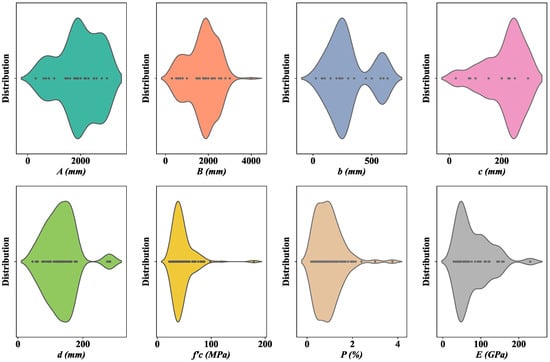 In conjunction with the researcher’s findings in Section 2.1 and taking into account the collectability of data, an aggregation of 189 experimental data sets was compiled from a thorough examination of 36 distinct research endeavors [,,,,,,,,,,,,,,,,,,,,,,,,,,,,,,,,,,], including key input variables: loading area shape (A, B), loading area dimensions (b, c), effective depth (d), concrete strength (f’c), FRP Young’s modulus (E), FRP reinforcement ratio (ρ); and output variable: punching shear strength (V). The statistical analysis of the data is shown in Table 1. The distribution of the data is shown in Figure 1.