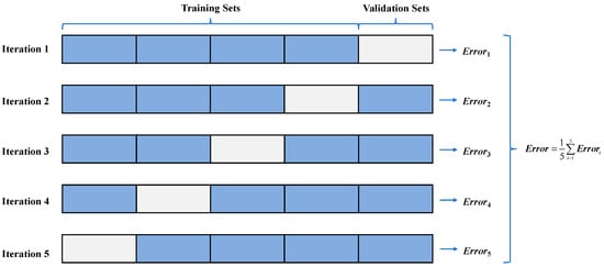 The 189 sets of data collected in Section 2.2 were used for model construction, of which 80% of the data were used as the training set and 20% as the test set. Six machine learning algorithms, linear regression (LR), support vector machine (SVM), BP neural network (BPNN), decision tree (DT), random forest (RF), and eXtreme Gradient Boosting (XGBoost), were used to construct the machine learning model. The reason for choosing these models is that the above six models have been widely used, and LR, SVM, and BP are the early classical machine learning models. DT, RF, and XGBoost, on the other hand, are all tree-based models; XGBoost was proposed in 2016 and is widely used due to its excellent performance on different data sets. All the above models were run on Python. The hyperparameters for each machine learning were obtained using grid search and five-fold cross-validation. Grid search is a method to find the best model hyperparameters by traversing different parameter combinations. Five-fold cross-validation is a commonly used method for model evaluation, and its principle is shown in Figure 2. The data set is partitioned into five equally sized segments, where four portions serve as the training dataset, and the residual segment constitutes the test set. The iteration process is repeated five times to get the average of the five sets of model performance evaluation results, which can be more accurate in evaluating model performance.