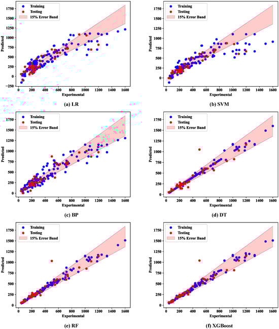 The comparison of the predicted and experimental values of each machine learning model is shown in Figure 3. The performance evaluation metrics are shown in Table 2.