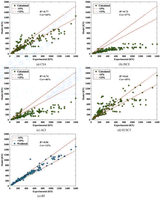As can be seen in Figure 4, the goodness of fit of both the codes and the researcher’s model is below 0.8. In addition, the coefficient of variation between the calculated and experimental values of their models is more than 60%. However, the RF model constructed in this study has a very high goodness of fit and coefficients of variation within 20%, which is much better than existing models.
