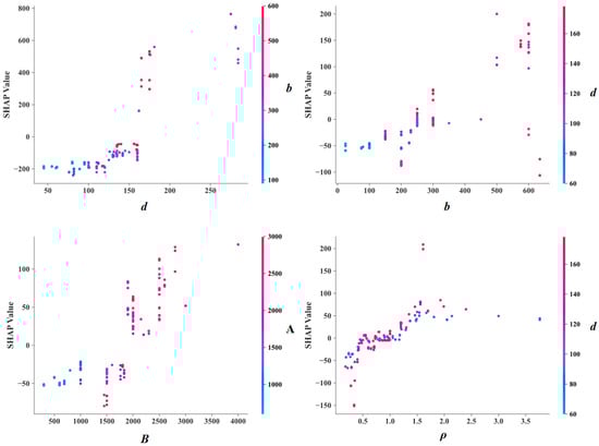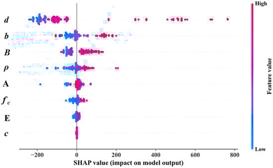 Figure 5 analyzes the importance of the parameters in terms of the entire data set. As can be seen in Figure 5, overall, effective depth (d) had the greatest impact on punching shear strength, while FRP Young’s modulus (E) and loading area dimensions (c) had a lesser impact on punching shear strength. Figure 6, on the other hand, provides a sensitivity analysis of the parameters from the perspective of the entire dataset. Taking the first four parameters with higher importance as an example, it can be seen from Figure 6 that all four parameters with higher importance had a positive effect on the punching shear strength, i.e., the punching shear strength improved as d, b, B, and ρ increased.