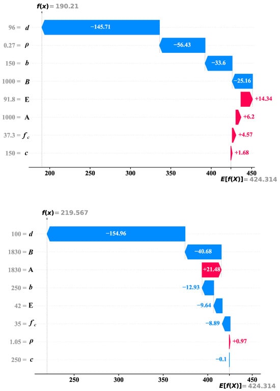 Figure 7 demonstrates that the importance and sensitivity of features to punching shear strength are different in different samples. For example, for the two samples mentioned above, ρ was inversely related to punching shear strength in the first sample and the opposite in the second sample. Similarly, E had a positive effect on punching shear strength in the first sample but a negative effect in the second sample. It is important to note that even though the effects of the features were not exactly the same in both samples, RF predicted them both better. The experimental value of the first sample was 181 KN, and the model predicted 190.21 KN with an error of 5.08%. The second sample had an experimental value of 218 KN, and the model predicted 219.567 KN with an error of 0.72%.