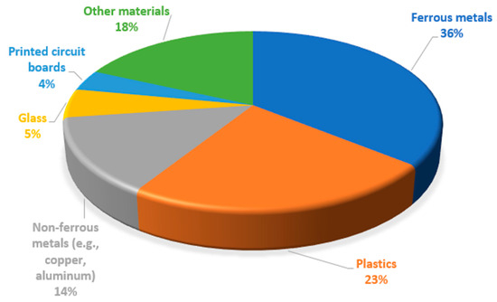 E-waste is the term used to describe any obsolete electronic/electrical devices. These range from large household appliances such as refrigerators and air conditioners to everyday devices such as mobile phones, personal stereos, and computers. There are 10 different categories of E-waste based on the European Waste Electrical and Electronic Equipment (WEEE) Directives 2002/96/EC and 2012/19/EU [22], as shown in Table 1. The composition of E-waste is shown in Figure 1.