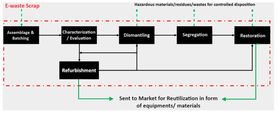 E-waste is made up of a multitude of different parts that differ depending on the product being considered. These components consist of more than 1000 substances, which are segregated into “hazardous” and “non-hazardous”. E-waste has a hazardous component as waste from electronics generally consists of heavy metals (including mercury, lead, and cadmium) and hazardous substances (for example, brominated flame retardants, PVC). Grant et al. [23] found that the hazardous constituents of E-waste can pose extensive problems for human health. These mainly pertain to growth, cellular function, thyroid function, lung function, and reproductive health. Less harmful metals, plastics, and even glass typically fall under the class of non-hazardous materials. Table 2 shows the hazardous characteristics of E-waste and their origins [24]. As there are so many high-value and toxic substances in E-waste that are harmful and difficult to decompose, they must be properly collected, treated, and managed to avoid the risk of their impact on the environment and human health. These steps can be taken by recyclers and facilities, which are required by United Nations Environment Programme (UNEP) rules to make a concerted effort to recycle and reuse obsolete EEDs. Furthermore, rare and valuable materials in EEDs should only be disassembled and recovered if reuse is not an option. It is advised that facilities and recyclers adhere to the recycling, renovation, and disposal procedures, as mentioned in Figure 2.