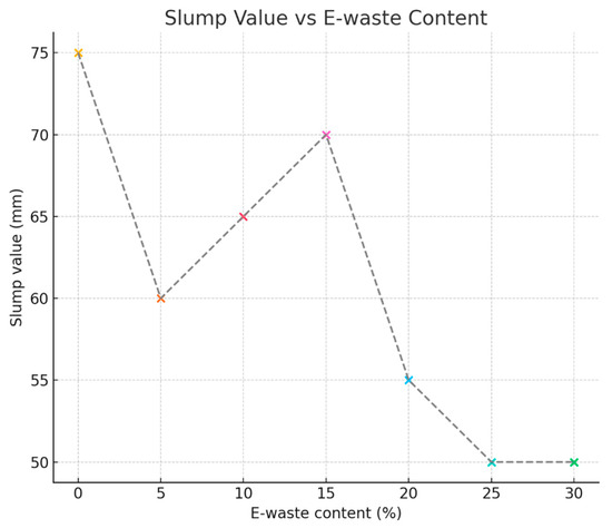 Workability of concrete as determined by slump tests also plays a vital role in assessing the ease with which the mix can be mixed, placed and finished. The literature on E-waste indicated that the incorporation of E-waste reduces workability significantly in concrete mixtures. The decrease in workability with the increase of E-waste content is mainly due to surface texture, which is rough and irregular, leading to high internal friction, resulting in less flow ability. Furthermore, the hydrophobic character of most E-waste substances, especially plastics, acts to lessen actual water articles in combination [64], which lowers or retards workability. Therefore, to help optimise mix designs and increase practical utilization of E-waste concrete, it is necessary to be able to understand the underlying mechanisms as well as thoroughly evaluate how different types and percentages of E-waste affect these properties.