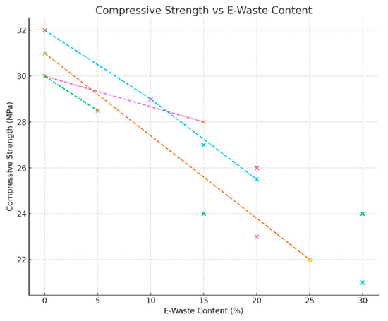 The mechanical properties of concrete itself, including the strength in compression and flexure and perhaps tension as well, are not only important for its performance but also provide a guide to quality. It has been found from studies that as the E-waste proportion increases, these properties often are decreasing. Kumar and Baskar [45] also revealed that the compressive strength decreased drastically when scaled to 100% E-waste substitution. The reduction in strength is attributed to several reasons, such as the increased porosity and density of E-waste aggregates that led to deterioration in the concrete matrix. Additionally, the smooth and hydrophobic surfaces of E-waste particles are a barrier to effective bonding with cement paste, while stiffness differences between E-waste versus natural aggregates result in stress concentration zones that trigger crack initiation and propagation [65].