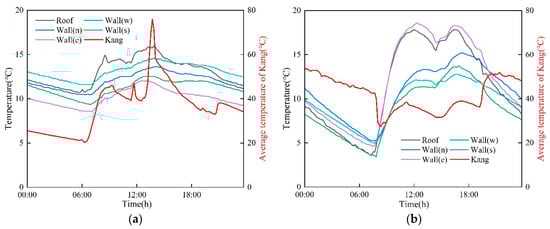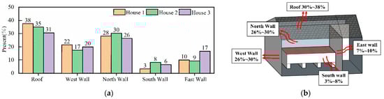 - In Kang-heated rural dwellings, roof, internal walls, and external walls directly in contact with the Kang exhibit the highest radiation heat losses, ranging from 30% to 38%, 26% to 30%, and 17% to 22%, respectively. This indicates that insulation measures must be added to these areas.