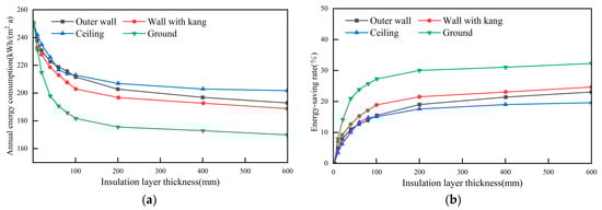 - The thickness of the exterior walls of all rural houses was 370 mm, 86% of the exterior walls were not designed with thermal insulation, and only 14% of them had implemented insulation measures. Additionally, the floors and roofs of these houses were generally not insulated. In this study, by integrating the findings from on-site research, the extruded polystyrene foam insulation board (XPS board) was taken as an example to optimize the design. Its thermal conductivity is 0.030 W/(m·K), and the market price is 380 CNY/m3 (USD52/m3).