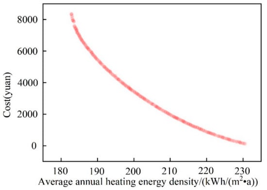 - The average annual heating energy consumption density of buildings corresponding to the optimal solution set for low-cost and low-energy consumption ranges from 180 to 230 kWh/(m2·a), resulting in a potential reduction in building energy consumption of up to 22%. The total cost of energy-saving renovations for rural houses can reach CNY 8000 (USD 1100), which is lower than the annual disposable income of rural residents, rendering them economically feasible.