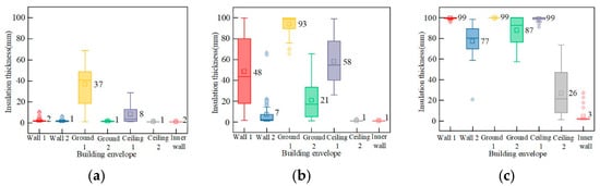 - Economically optimal energy-saving technology. The Pareto-optimal solution with the renovation cost lower than CNY 2000 (USD 275) is selected, as shown in Figure 9a. In this case, the insulation is concentrated in the bedroom–living room floor and the bedroom–living room roof, with average thicknesses of 40 mm and 10 mm, indicating that the insulation yields better energy-saving effects and higher economic benefits. Rural residents should give priority to the renovation of this area when upgrading their farmhouses. Compared to the reference house, the energy-saving rate is within 10%, making it a more economically viable technology within the calculation cycle.