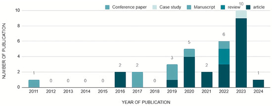 The selected studies [99,100,145,146,147,148,149,150,151,152,153,154,155,156,157,158,159,160,161,162,163,164,165,166,167,168,169,170,171,172,173,174] were published from 2011 to 2024. Interestingly, the first seven years of this period (2011–2017) saw only five published studies, with 60% (n = 3) of them appearing in conference papers and the remaining 40% (n = 2) in articles. However, the latter six years (2019–2024) saw an increase in attention to this topic, with 27 studies published (84.38% of all the selected studies). The highest number of publications occurred in 2023. Articles made up more than 60% (n = 22) of the studies, followed by conference papers, reviews, manuscripts, and case studies at 9.38% (n = 6), 6.25% (n = 2), 3.13% (n = 1), and 3.13% (n = 1) (Figure 2).
