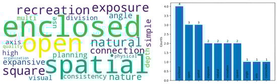For the space aspect, the discovered theme is “Striking a balance between enclosed and open spaces while maintaining exposure or connection to nature”. Although seemingly contradictory, this theme is deduced from the prevalence of “enclosed” as the most frequently used word and “open” as the second-most mentioned word. Additionally, the emergence of “exposure” and “natural” further reinforces the notion of achieving harmony between these contrasting elements (Figure 4).