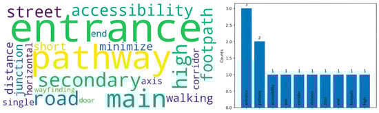For the movement aspect, the identified theme centers on “Accessible entrances and pathways”. explained by the prevalence of “entrance” as the most frequently mentioned word, followed by “pathway” and “accessibility” as the second- and third-most mentioned words, respectively (Figure 5).