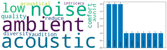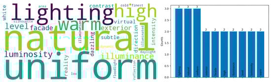 For the light aspect, the theme emerged as “Uniform and natural lighting with a warm tone”. This theme is supported by the equal occurrence of “lighting”, “natural”, and “uniform” as the most frequently mentioned words, with “warm” also contributing significantly to the theme formulation (Figure 6).