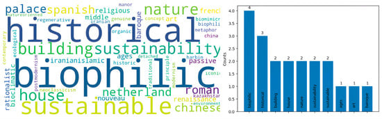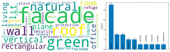 As stated in Section 3.3.1, word frequency analysis was conducted to address research question 1: the outcomes include integrating word clouds, standard word bar charts, and themes associated with each architectural aspect. The word clouds offer a visual depiction of prominent keywords corresponding to each architectural element, facilitating a comprehensive comprehension of the data. Meanwhile, the bar charts convey the frequencies of individual words, providing quantitative information. The formulation of themes is derived from an amalgamation of these two components—the word cloud and the word frequency bar chart—thereby making sense of the keywords.