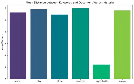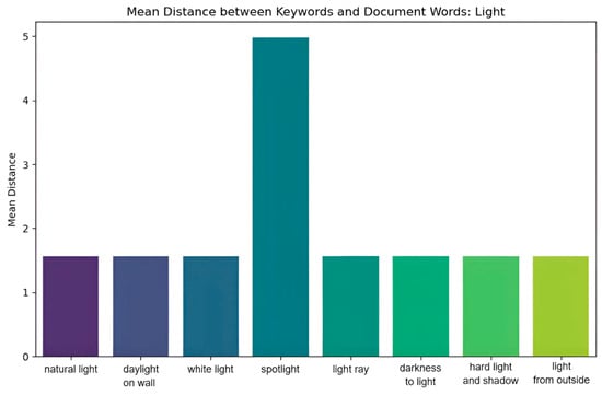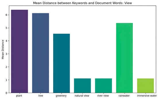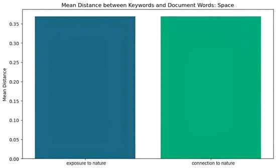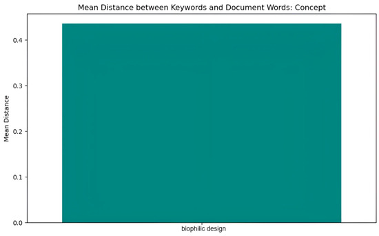 To answer research question 2, we employed semantic distance analysis. The objective is to explore the semantic associations between the corpus extracted from the included article and keywords relevant to biophilic design. This NLP technique evaluates the degree of relationship between text elements by leveraging a common distributed representation (i.e., dictionary), such as Word2vec or Latent Semantic Analysis language models [136,140]. These language models are typically developed and trained on extensive datasets, such as entire English Wikipedia articles, the Touchstone Applied Science Associates (TASA) corpus, or even social media data from platforms like X (formerly known as Twitter) [136,140,141]. Among these models, global vectors for word representation (GloVe) have emerged as one of the most widely used due to their versatility [142,143]. The GloVe model has been trained on a vast vocabulary, ranging from 400,000 words in its lightest variant to 2.2 million in its largest variant, with a data source encompassing 2 billion tweets, indicating its extensive coverage [142]. The GloVe model exhibits comparable performance to other popular models while being less computationally demanding, particularly when utilizing its lighter variant [142]. Therefore, we opted for the GloVe algorithm for its practical implementation advantages.