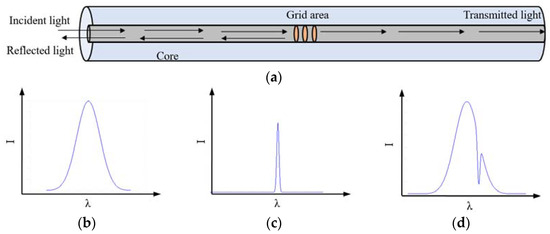 Sensing principle of fiber grating: (a) Fiber grating structure schematic, (b) Input Spectrum, (c) Reflectance spectrum, and (d) Output Spectrum.