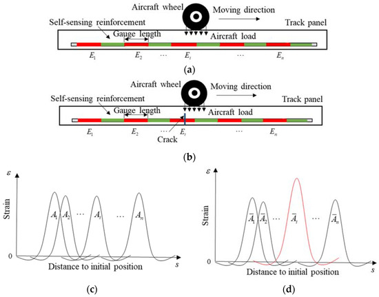 In order to ensure the long-term monitoring needs of the sensor, without affecting the structural stress performance of the pavement and the rapid construction of the factory, the group used the slotted steel bar on the distributed fiber optic grating encapsulation to form a self-sensing bar for pavement crack monitoring. As the airplane operates on the pavement, each long-scale pitch FBG sensor produces a strain variation curve as shown in Figure 3c. The envelope area of the strain curve at each sensor location can be constructed as a series.
