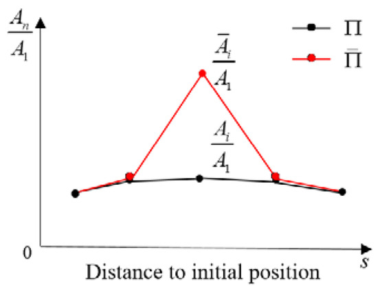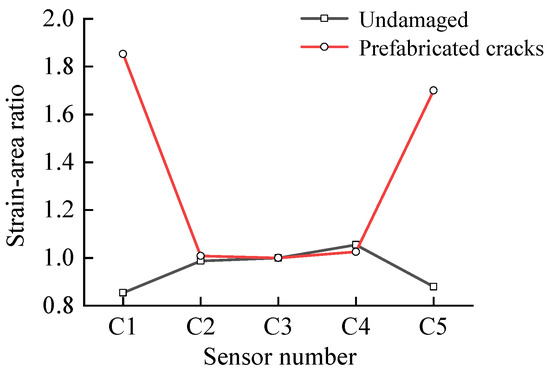 The strain curve envelope area monitored at one of the intact sensor locations is used as a reference, and the series is normalized to obtain the strain curve envelope area ratio distribution. Taking the sensor as an example, the calculation formula is as follows: