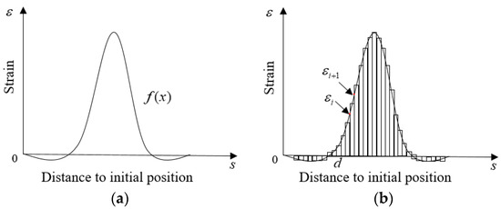 Since the strain over distance curve cannot be expressed using a specific formula, therefore the curve is divided into n rectangles as shown in Figure 5b; solving the sum of the areas of the n rectangles is approximately equal to the area of the envelope of the strain curve. Where the height of each rectangle is , and the width is . The specific formula is as follows.