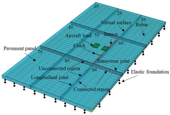 The establishment of prefabricated pavement 9-plate combination finite element model, with pavement panel thickness of 0.3 m, size 2.5 m × 5 m, joint width of 8 mm, reinforcing steel using structural reinforcement, upper and lower two-layer bi-directional reinforcing, the thickness of the protective layer of 50 mm, is shown in Figure 6. The road pavement is modeled with three-dimensional solid modeling, the modulus of elasticity of concrete is taken as 36,000 MPa, Poisson’s ratio is taken as 0.15; the modulus of elasticity of steel reinforcement is taken as 200 GPa, Poisson’s ratio is taken as 0.33, which is “built-in” in the pavement panel, and the grid cell type of steel reinforcement is truss. The Winkler foundation model is used to simplify the pavement subgrade and soil base into a composite spring and define the corresponding foundation reaction coefficients, and the foundation simulation adopts the “elastic foundation” in the interaction module of Abaqus, and the modulus of reaction of the top surface of the subgrade is taken as 150 MN/m3 by specifying the foundation surface in contact with the pavement slab [25]. The joint connection between slabs is very important for the mutual load transfer of prefabricated pavement panels, and the connection between pavement panels is realized by establishing virtual surface layer [26], and the elastic modulus of the longitudinal joint connection area is taken as 100 MPa; the elastic modulus of the transverse joint connection area is taken as 50 MPa, the elastic modulus of the non-connection area is taken as 5 MPa, and the Tie connection is adopted between the virtual surface layer and the pavement panels.