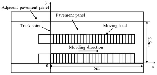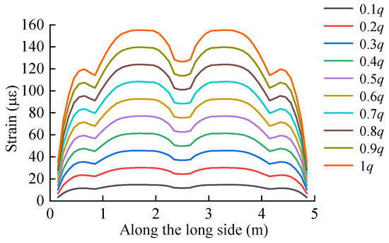 The B-737-800 model is used to apply the moving load along the longitudinal side of the plate, and the load level is taken as 0.1~1 times the tire pressure to extract the maximum strain generated at the bottom of the plate when the load is applied, as shown in Figure 9. The strain is at a maximum when the load is in the non-connected area, which is the location where cracks are likely to occur, so the crack location is selected as the middle of the two connected areas at the longitudinal joints of the pavement panel in the finite element simulation, as shown in Figure 10.